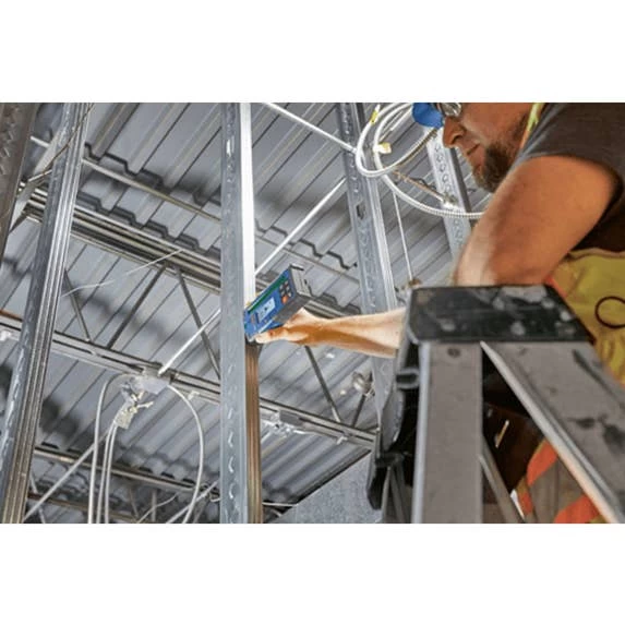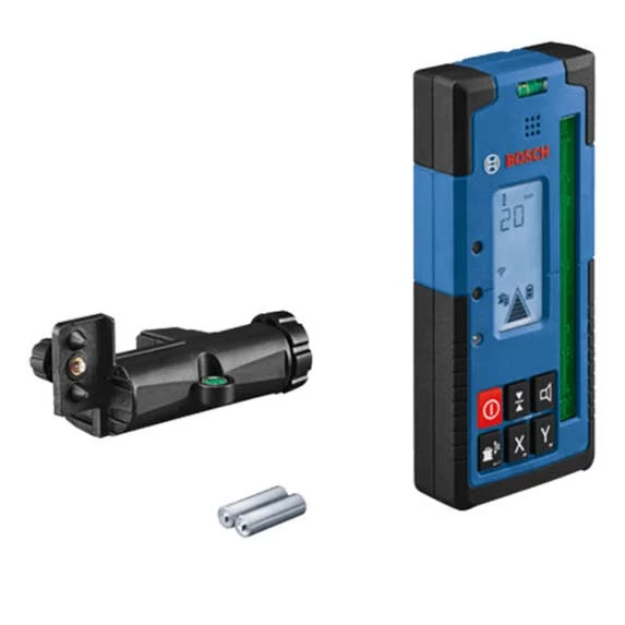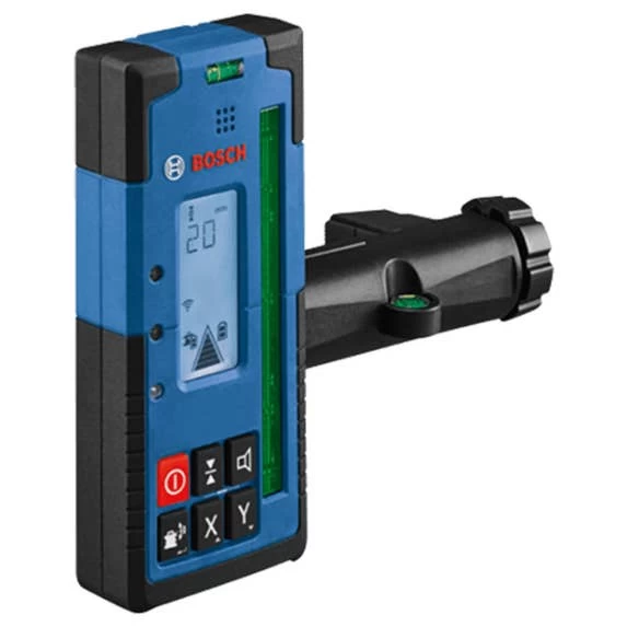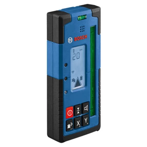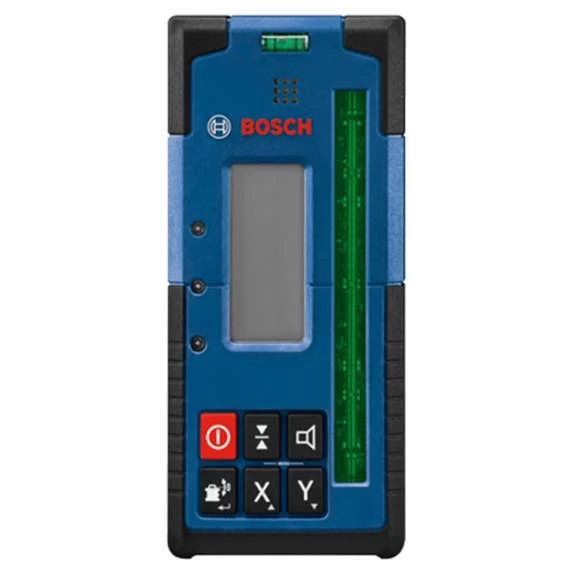 The Bosch LR40G Green-Beam Rotary Laser Receiver is designed to enable the GRL4000-90CHVG rotary laser detection up to 2,000 Ft., with a dual-sided backlit LCD display for use in darker areas or outdoors on both sides of the receiver. It has built-in X and Y-axes buttons that allows for elevation and cut-and-fill calculations in both axes up to ±8.5%. The display illuminated large, easy-to-see indicators, including up/down arrows, center line, accuracy level, battery levels and audio signal. It also has LED indicators, to provide easy visual readout and simple operation. The oversized laser detection area helps find the laser beam faster, making it easier to start setting level. The receiver provides convenience features such as built-in magnets for secure attachment to metal surfaces, an adjustable audio indicator, intuitive six-button keypad, receiver vial, attachment hook and ergonomic soft grip.