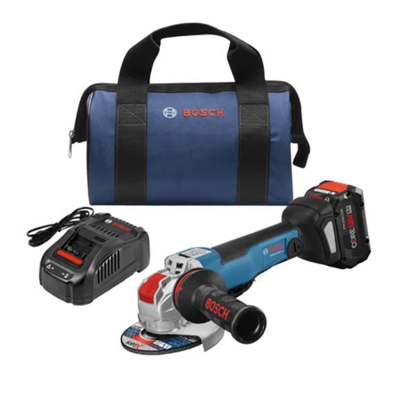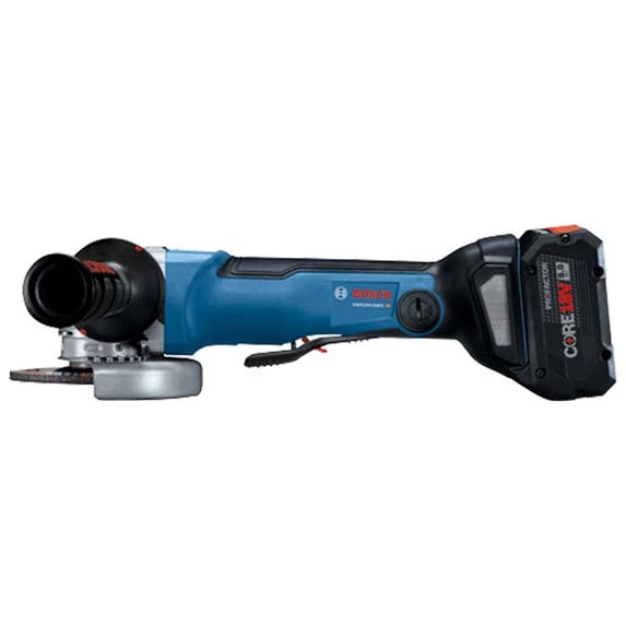 The Bosch GWX18V-50PC 18V 4-1/2 – 5 In. Angle Grinder with a CORE18V Performance Battery kit features a tool with the