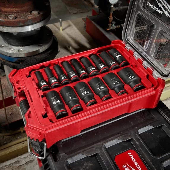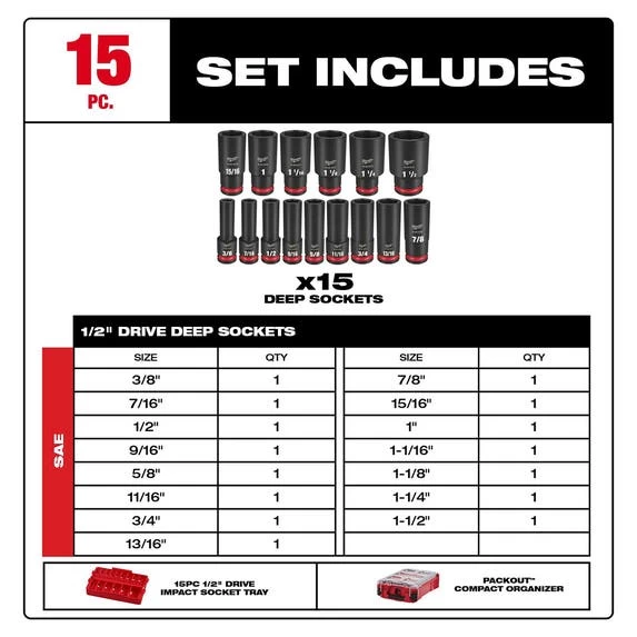 15Pc. SHOCKWAVE Impact Duty 1/2″ Drive SAE PACKOUT Deep Socket Set 49-66-6802