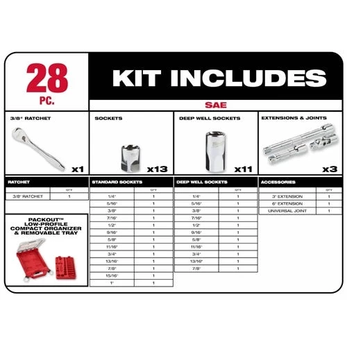 Milwaukee SAE 28 piece 3/8″ drive Ratchet & Socket set is designed from the ground up; offering our users the Most Versatile Sockets that are Anti-Roll and Wrench-Ready. Its innovative FOUR FLAT Sides feature an anti-roll and wrench-ready design. The 90 tooth ratchet tool offers 4° of arc swing and a slim profile design; allowing you to work in tighter and more confined spaces; be it under the hood of a car or in the middle of a remodel. The ratchet and socket kit comes with a removable inner tray which is perfectly designed to be stored long-term in a steel storage chest. All of our sockets are stamped with SAE measurements on the flat side for easy-to-read visibility. Milwaukee ratchet and socket set is backed by our Lifetime Guarantee.