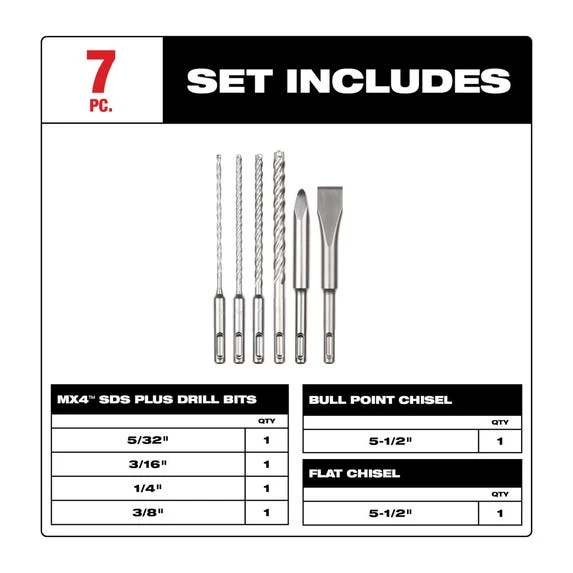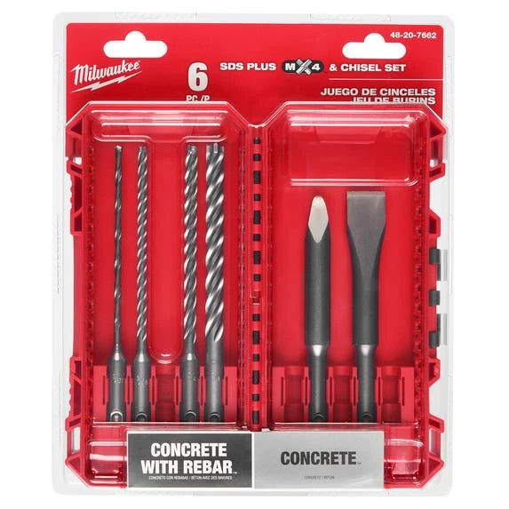 The Milwaukee MX4 4-Cutter SDS PLUS Drill Bits with solid head carbide deliver up to 5x longer life in concrete with rebar. Engineered with rebar guards to provide maximum durability in hard aggregate and rebar. The MX4 4-Cutter Bits are designed with sharp centering tips for exact spot drilling in concrete and metal decking. The 4-cutter design prevents lock-up in rebar, reducing downtime. Variable flutes remove dust faster, reducing heat and delivering up to 20% more holes per battery charge. The wear mark indicator on each drill bit shows you when the bit no longer meets the ANSI requirement. The MX4 4-Cutter Drill Bits are ideal for concrete with rebar and masonry applications. MILWAUKEE SDS Plus Chisels are made from high-grade, forged steel, providing up to 20% longer life. Packaged in a medium, double-sided hard case designed for use in the MILWAUKEE PACKOUT Storage System.