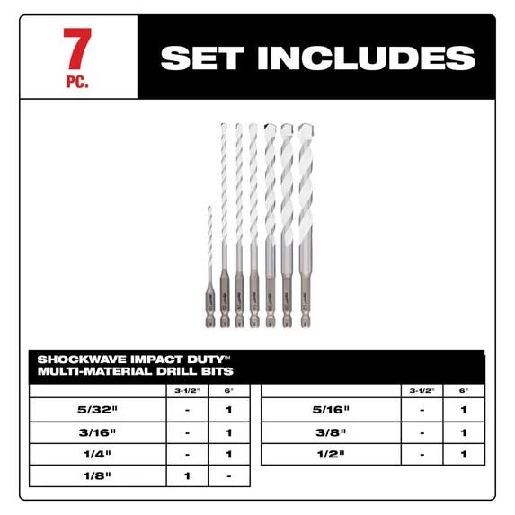 The Milwaukee SHOCKWAVE Impact Duty Carbide Multi-Material Drill Bits are the most versatile bits, designed to tackle materials such as brick, block, concrete, steel, aluminum, ceramic tile, backerboard, wood, PVC, and drywall. The aggressive, multi-grind carbide tip delivers up to 10x longer life in stacked materials and up to 85% faster drilling speeds in metal. Equipped with a 1/4″ hex shank, these general-purpose bits are compatible with impacts, drill/drivers, and hammer drills. The Milwaukee SHOCKWAVE Multi-Material Drill Bits provide the ideal all-in-one solution for the widest variety of materials, tools, and applications. Packaged in a medium, single-sided hard case designed for use in the MILWAUKEE PACKOUT Storage System.