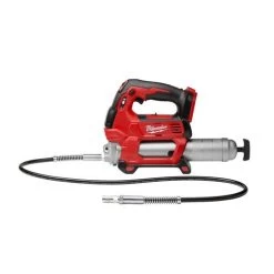 - The M18 Cordless 2-Speed Grease Gun delivers maximum pressure and unmatched versatility; offering an industry leading 10;000 PSI max operating pressure and a patent pending pre-set grease counter that allows service and maintenance professionals to dispense precise amounts of grease. The tools 2-speed design offers users the ability to select between max pressure and max flow rate. Other unique features include an on-board LED light; a lock-on/lock-off trigger; and a plunger rod with markings to gauge how much grease is left in the barrel. Â The tools stand up design and shoulder strap capability offer user convenience; while limiting fatigue and the 48 flexible hose offers greater accessibility when greasing hard to reach fittings. The new tool is also compatible with a clear barrel accessory (49-16-2646). Â Powered by an M18 REDLITHIUM Battery pack; this is the industrys only 18V grease gun thats battery is compatible with a system of tools. The kit includes the new multi-voltage charger; so you can charge all M12 and M18 lithium-ion batteries with one charger.