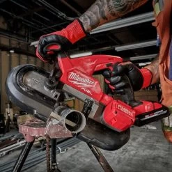 The M18 FUEL Compact Dual-Trigger Band Saw incorporates a Dual-Trigger Design for Safe Cutting which requires triggers located on both the back and front handle to be engaged in order to operate. The MILWAUKEE M18 FUEL Compact Band Saw offers a light-weight; balanced design with the largest cutting capacity of any compact band saw at 3-1/4” X 3-1/4”.