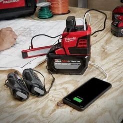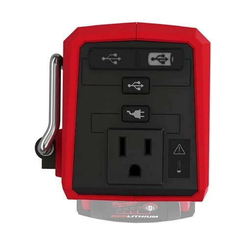 The MILWAUKEE M18 TOP-OFF 175W Power Suply delivers faster simultanous power to personal devices and small electronics. Attach any M18 battery to provide continuous power or recharge devices with (1) AC 120V outlets; (1) USB-C PD port; and (1) USB-A port. Quickly charge up to three devices at the same time; without the barriers of speed throttling. With the USB-C PD port (45W); this battery inverter is capable of recharging devices; from a fully depleted state to 80% capacity up to 75% faster than conventional wall chargers (5W). The compact portable power supply has an attached metal rafter hook that can be extended to hang it from carts; lumber; or other jobsite materials when worksurface space is limited. Instantly set up a mobile workstation or keep electronics securely within eyeshot; rather than making frequent trips to a wall outlet. This tool is not recommended to run large devices and power tools or to charge batteries and heated gear.