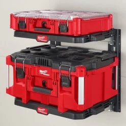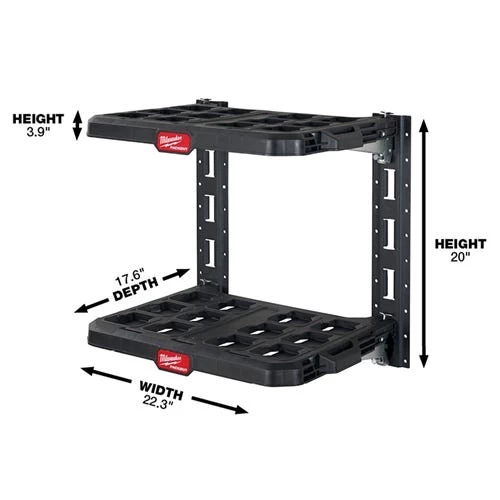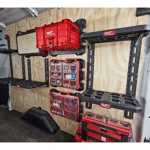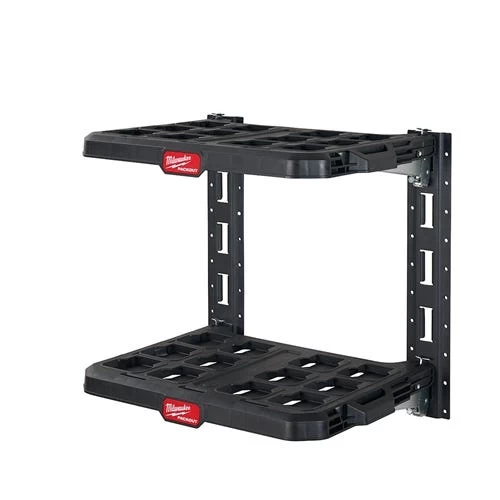 The Milwaukee PACKOUT Racking Kit includes two PACKOUT racking shelves and two lengths of E-Track to attach and mount the racking system to a wide variety of surfaces: including vans, trucks, trailers, garages, and shops. These tool storage racks have a 50lbs weight capacity per shelf with metal reinforced frames and impact-resistant bodies that allow for customization of a PACKOUT System. This Racking Kit is part of the PACKOUT Modular Storage System, the industry’s most durable and versatile storage system.