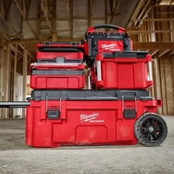 The MILWAUKEE PACKOUT Rolling Tool Chest allows users to bring two PACKOUT stacks onto the site with a Dual Stack Top and a 250lb weight capacity. The tool chest is constructed with impact-resistant polymers and water and debris protection to withstand harsh jobsite conditions. An industrial-grade extension handle and 9″ all terrain wheels ensure this tool chest can be rolled anywhere on the jobsite. With a 35 gallon capacity, and an interior organization tray, this tool chest keeps users’ equipment organized to fit their needs.