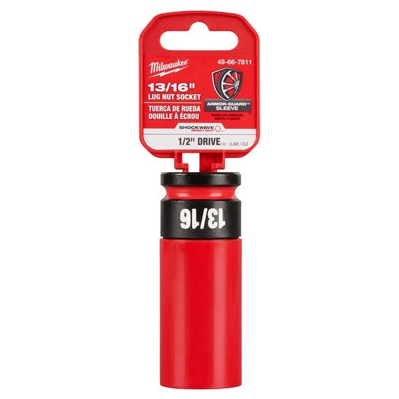MILWAUKEE® SHOCKWAVE Impact Duty™ 1/2 Drive 6 Point Lug Nut Wheel Sockets feature the Most Durable, Non-Marring Sleeve to protect rims during tire changes. The ARMOR-GUARD™ Sleeve is made with premium, durable plastic for Lasting Protection against cracking or shredding during wheel installation and removals. The sockets are thin-walled for easy access in tight wheel assemblies and feature a non-marring plastic insert to protect lug nuts during use. The sleeves are color-coded, Gray for Metric sizes and Red for SAE sizes, to ensure easier socket selection while also featuring stamped & ink filled sizes for the Boldest, Longest Lasting markings. Milwaukee sockets are engineered with high strength forged steel for optimized performance in heavy-duty applications. The dual-hole design and ring groove allow for easy socket attachment and removal. MILWAUKEE® SHOCKWAVE Impact Duty™ Lug Nut Wheel Sockets are optimized for use with 1/2″ drive impact wrenches, drivers, ratchets, and adapters and meet ASME industry standards for thin-walled sockets.