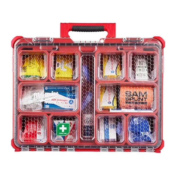 Our PACKOUT Class B Type III First Aid Kit is part of the most versatile, durable, modular storage system. Our first aid kit’s impact-resistant body keeps contents safe from drops and bumps on the jobsite. An IP65 rated weather seal protects bandages, adhesives, antibiotics, and other essential medical supplies from rain and other jobsite debris. Our jobsite first aid kit’s no-travel bin seals to keep all contents secure and in their proper place. The MILWAUKEE PACKOUT Organizer comes with 193 essential first aid items tailored to the most common injuries you encounter on the jobsite. The transparent lid of the organizer seals the contents from migrating and shifting during transport. Heavy duty latches and reinforced hinges ensure that the organizer keeps the contents contained and protected.